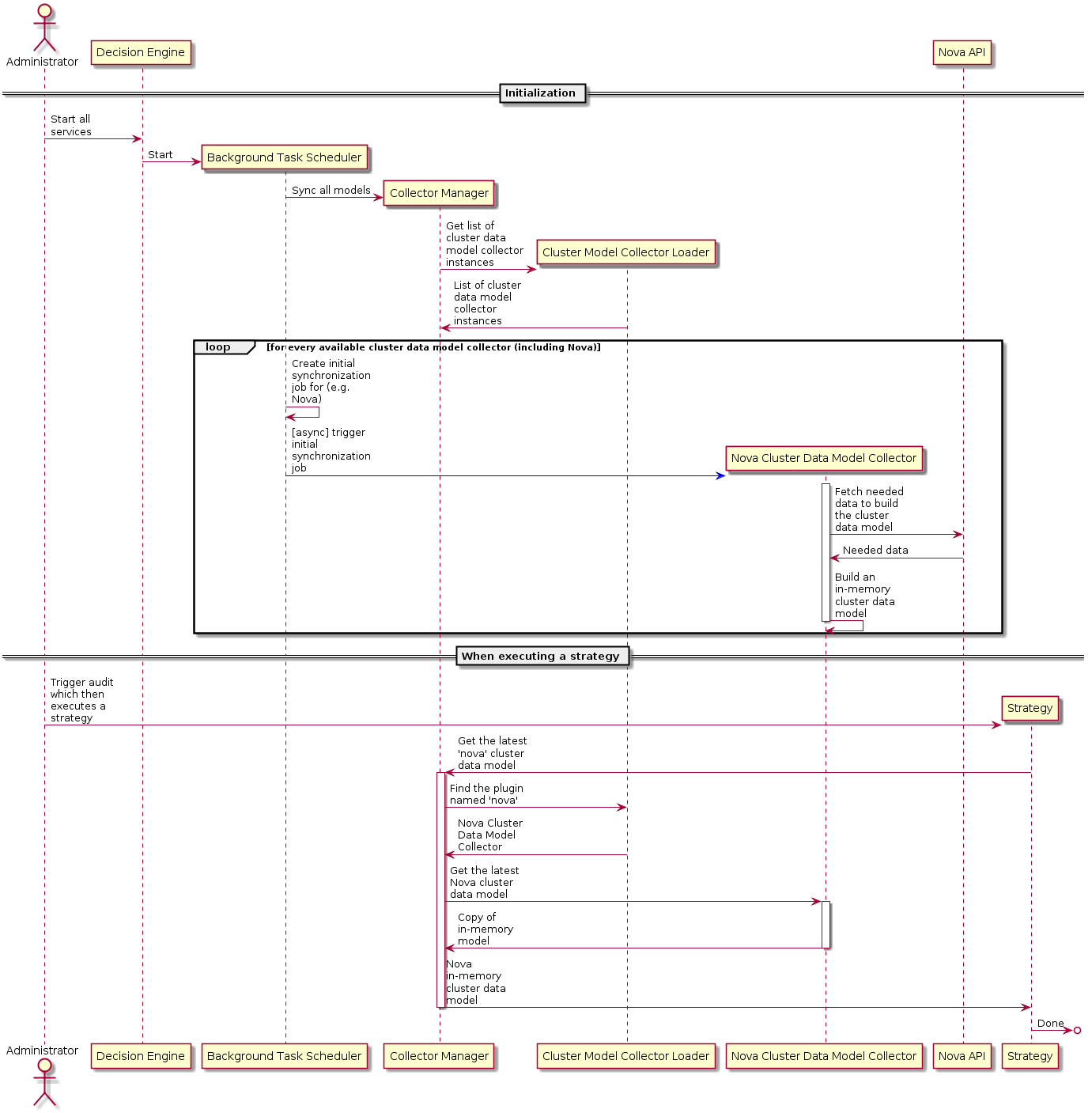 BaseClusterModelCollector 的每个实现应在实例化时开始填充其内存缓存,最好不要阻塞其他代码执行以快速启动服务。 这些实现还应定义定期任务,这些任务负责(最好通过使用线程异步方式)与服务同步缓存。 例如,对于 NovaClusterModelCollector,此定期任务将负责向 Nova 发出 API 请求以获取所有超visor 和服务器。 根据该 API 请求的响应,将相应地更新缓存。 这些同步任务的运行速率应该是可配置的,但一个合理的默认值可能在每 60 分钟左右。
